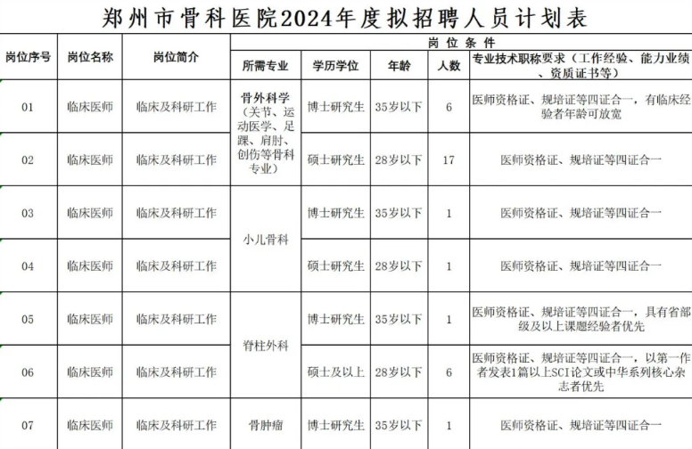 招 191 人!郑州市骨科医院 2024 年公开招聘