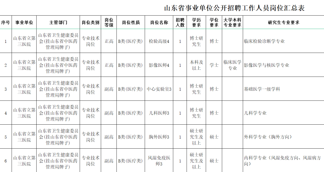 山东省立第三医院是集医疗、教学、科研、预防保健和康复为一体的山东省卫生健康委直属的三级甲等综合性医院。根据事业单位公开招聘有关规定,结合工作需要,山东省卫生健康委所属山东省立第三医院拟面向社会公开招聘,均为专业技术岗位。