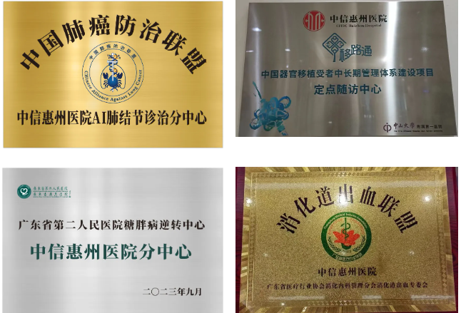 中信惠州医院始建于 2005 年,是央企中国中信集团一级子公司中信医疗健康产业集团旗下,集医疗、保健、康复、教学、科研为一体,学科特色明显、名医专家众多、优势技术领先的国有大型三级综合医院。医院获国家卫生健康委「改善医疗服务示范医院」、中国医院竞争力百强、广东社会办医十大热心公益医院、惠州市医保信用等级最高等级 A 级等多项荣誉;为中华医学会结核病学分会呼吸内镜介入诊疗技术培训基地、中华医学会结核病学分会呼吸内镜介入专业组常委单位;是中国出生缺陷干预救助基金会出生缺陷干预救助项目实施医院;为南部战区总医院「军民共建医院」、南方医院和广东省第二人民医院等多家名院医联体单位和专科联盟单位。