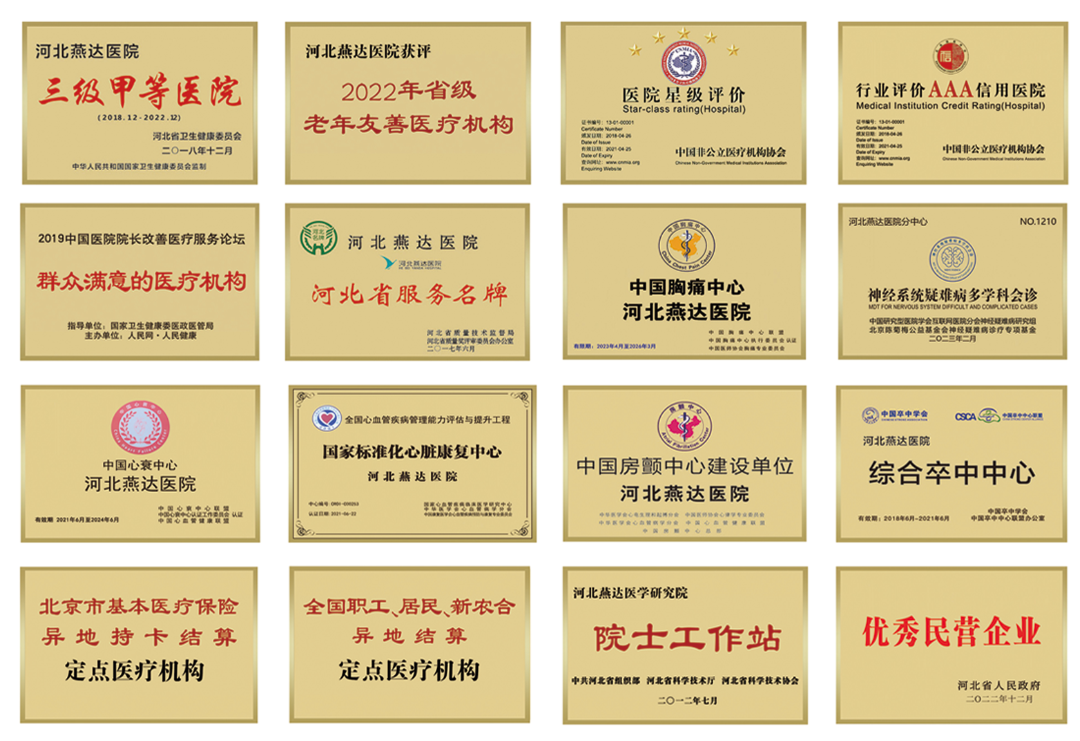 目前,河北燕达医院为河北医科大学、承德医学院等十余所高等医学院校合作医院;是三河市社区卫生服务定点医院、三河市孕产妇危急重症救治中心、廊坊市 120 急救中心北三县分中心、国家标准版胸痛中心、国家标准版心衰中心、国家标准化心脏康复中心、中国卒中学会综合卒中中心、国家卫健委能力建设和继续教育神经介入建设中心、国家卫健委肿瘤微创介入建设中心、京津冀临床检验及影像结果互认定点医疗机构、北京神经系统疑难病多学科会诊中心-分中心;先后荣获河北省优秀民营企业、河北省文明单位、河北省服务名牌单位、省级老年友善医疗机构等省级荣誉;获评中国非公立医疗机构协会「能力评价五星」、「信用评价 3A 级」医院 (全国首批最高等级)。