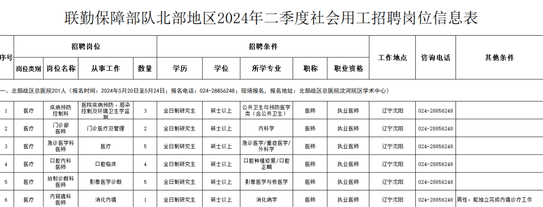 北部战区总医院 201 人(报名时间 2024 年 5 月 20 日至 5 月 24 日)