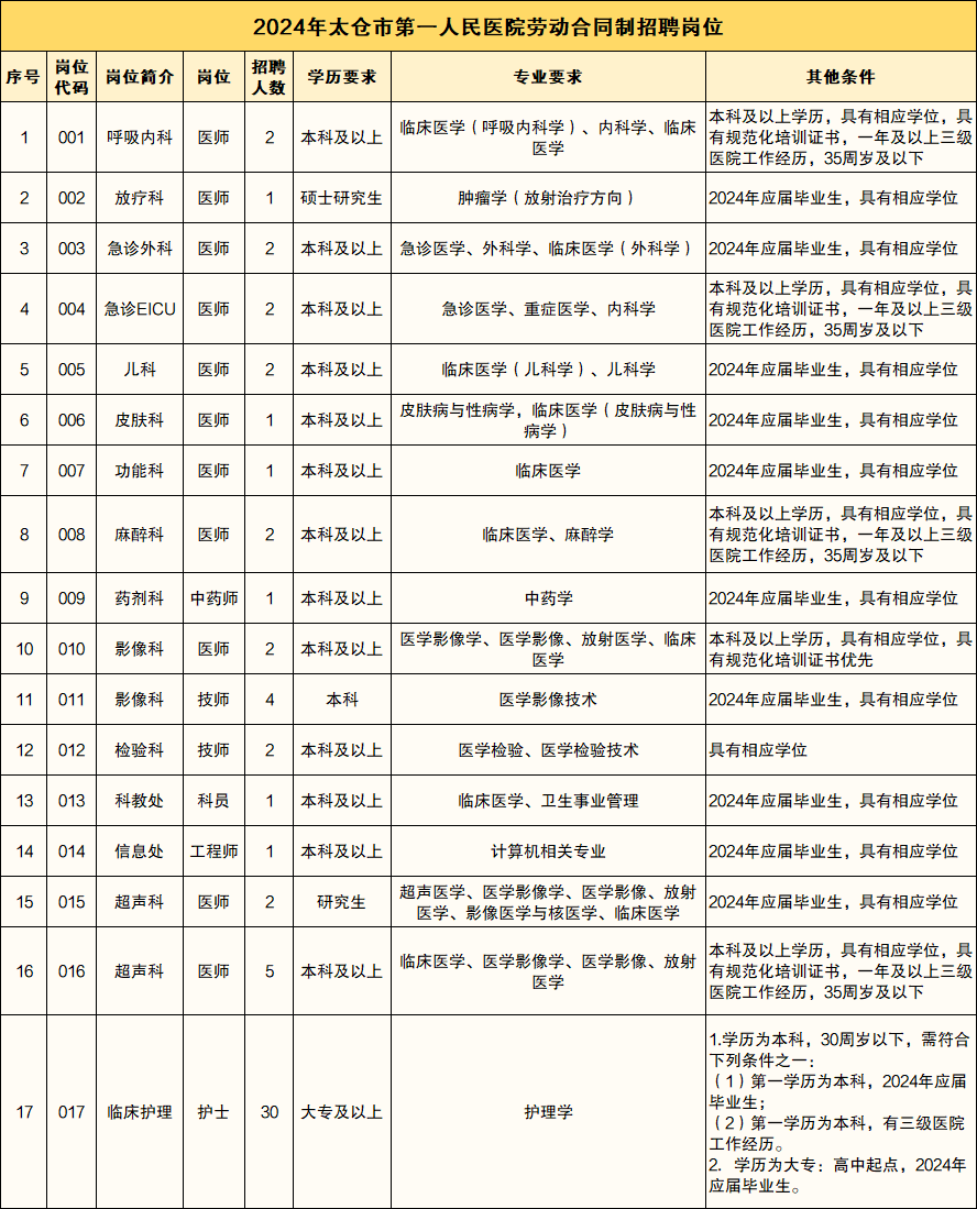 太仓市第一人民医院按照人力资源规划及业务需要,2024 年面向社会公开招聘劳动合同制专业技术人员 61 名。详细情况如下: