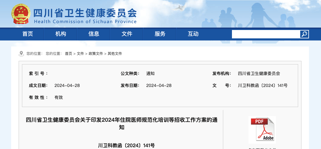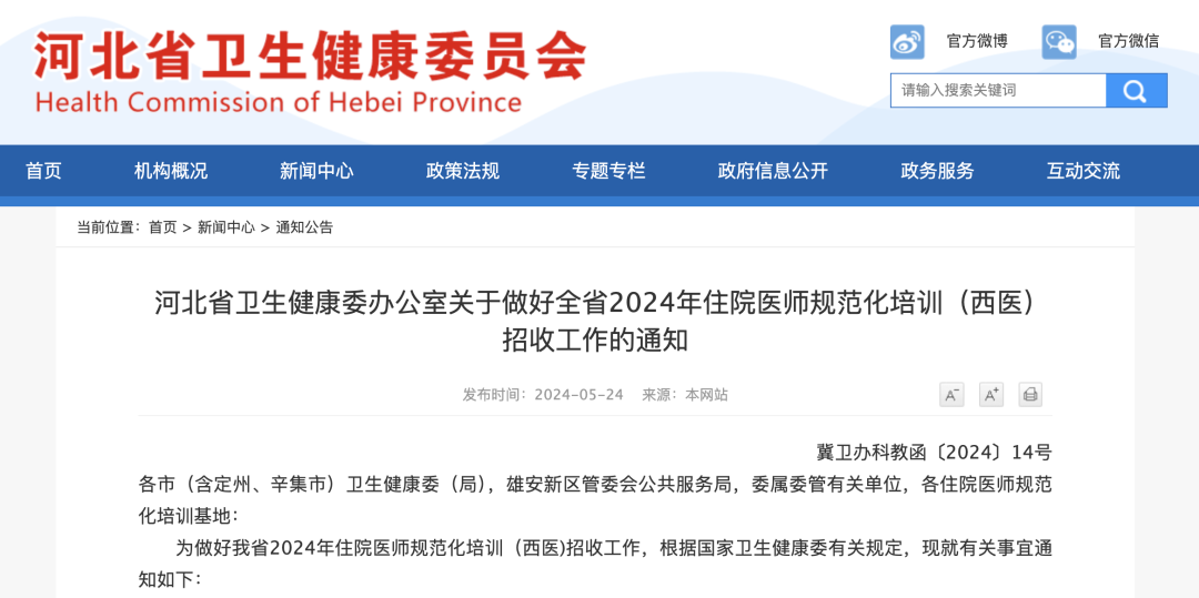 5 月 24 日,河北省卫生健康委员会发布了《关于做好全省 2024 年住院医师规范化培训(西医)招收工作的通知》,其中提到: