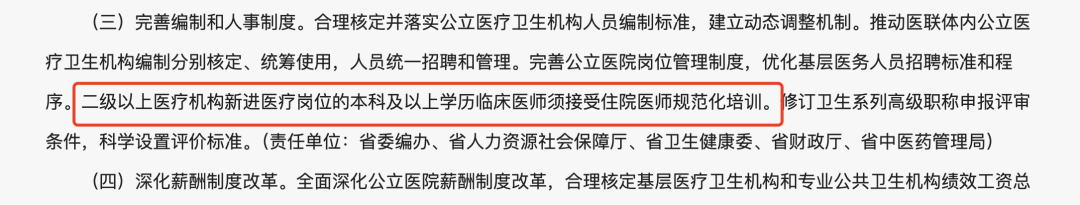 在去年河北省人民政府印发的《关于进一步完善医疗卫生服务体系实施方案的通知》中,就对二级以上医疗机构的人员招聘做了规定,要求新进医疗岗位的本科及以上学历临床医师必须完成规培。