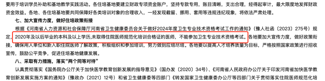 今年 3 月,河南省卫健委发布的《关于做好 2024 年住院医师规范化培训招收工作的通知》中,提到了有关住培政策衔接方面的规定,「2020 年及以后毕业的本科及以上学历,未取得住院医师规范化培训合格证的医师,不能参加卫生专业技术资格考试」。