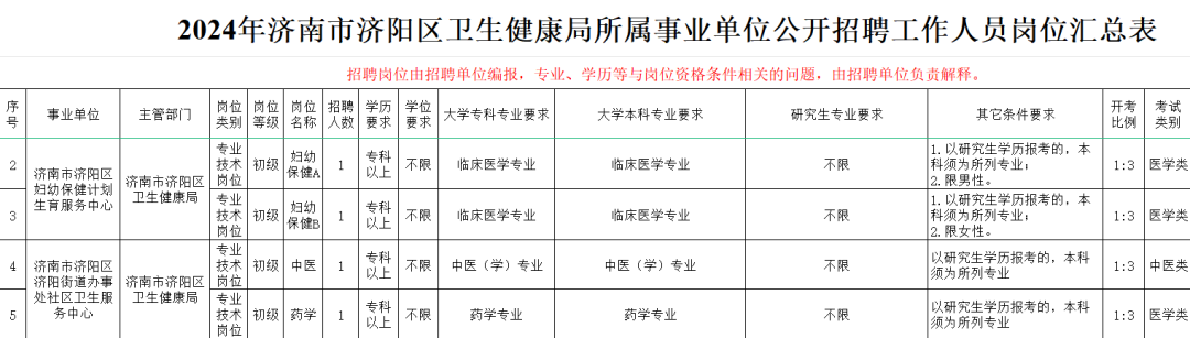 根据事业单位公开招聘有关规定,结合济南市济阳区卫生健康局所属事业单位岗位空缺情况和工作需要,现将 2024 年度济南市济阳区卫生健康局所属事业单位公开招聘工作人员有关事项公告如下: