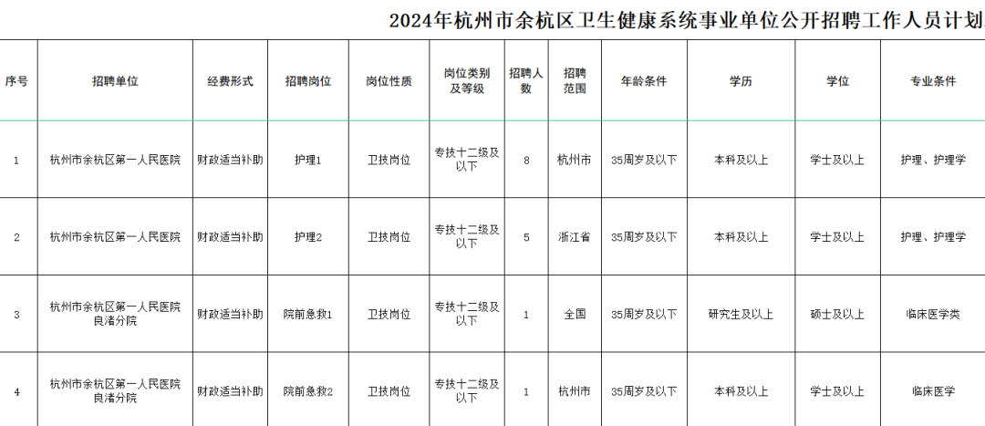 根据《关于贯彻落实国家人事部 〈事业单位公开招聘人员暂行规定〉 的实施办法》(等文件规定,2024 年杭州市余杭区卫生健康系统事业单位将面向社会统一招聘工作人员。现将有关事项公告如下: