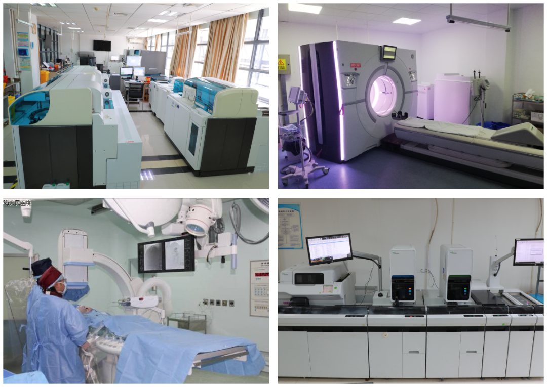 医院拥有全球顶级的美国 GE 公司 256 排 512 层超高端螺旋 CT、西门子介入最强的双 C 臂全数字血管造影机 (DSA)、GE 公司超导型 3.0T 核磁共振 (MRI)、锐珂数字化 X 射线摄影成像系统(DR)、GE 先进全数字化乳腺 X 光机、罗氏全自动生化免疫流水线、法国梅里埃快速微生物质谱鉴定仪、法国梅里埃全自动微生物鉴定药敏分析系统、希森美康全自动血液分析系统、GE Voluson E10 高端四维妇产超声诊断仪 、GE Vivid E95 (心脏、血管) 超声诊断仪、富士阿络卡 ARIETTA 850 全身彩超机及各门类齐全的腔镜等国内外高精尖的医疗设备,为医院专业发展奠定了坚实的基础。