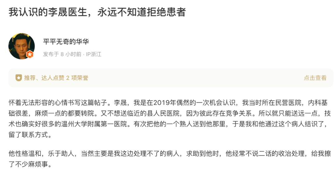 丁香园论坛网友 @平平无奇的华华 发布长文《我认识的李晟医生,永远不知道拒绝患者》,文中写到:「在我脑海中,他就是一位永远不知道拒绝病人的医生,总是用满腔的热血在对待工作,办公室和手术台就是他的战场,而他就是那位时刻准备上战场的人。」