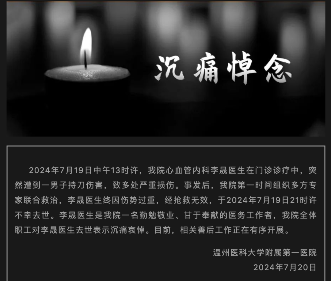 事发后,该院第一时间组织多方专家联合救治,李晟医生终因伤势过重,经抢救无效于 2024 年 7 月 19 日 21 时许不幸去世。该院全体职工对李晟医生去世表示沉痛哀悼。目前,相关善后工作正在有序开展。
