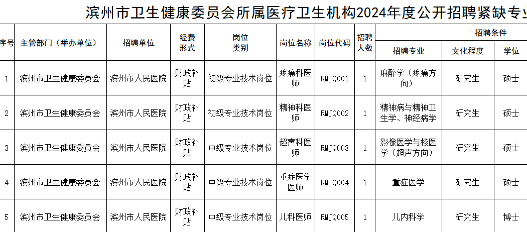 招 181 人!滨州市卫健委所属医疗卫生机构 2024 年公开招聘