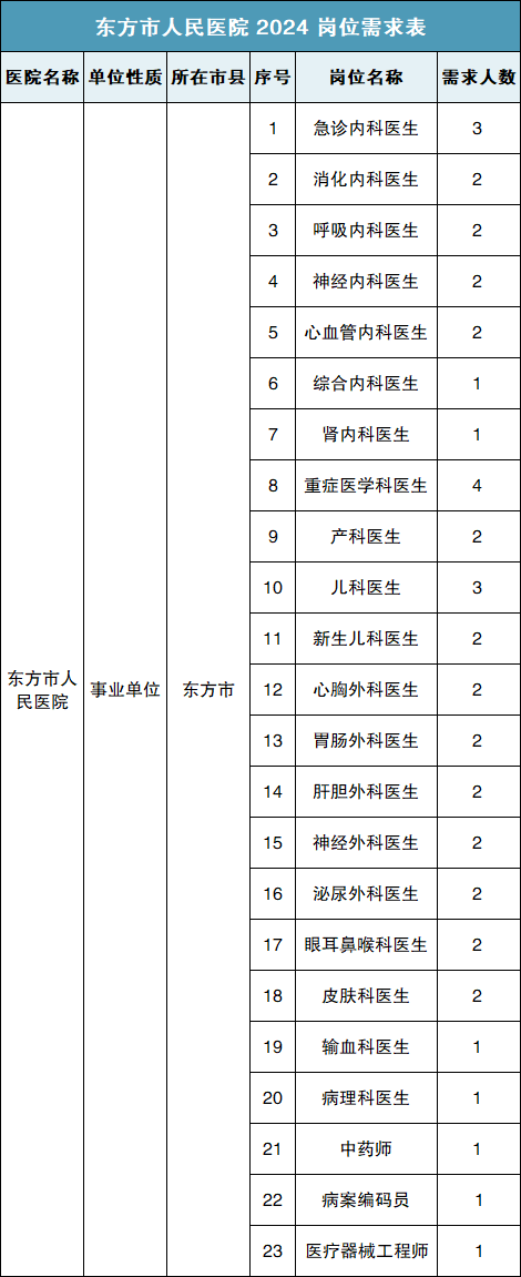 全院各类人员共 1,138 人,专业技术人员 912 人(其中正高职称 59 人,副高 121 人,中级职称 269 人,初级职称 463 人。),占全院 80.1%。医生 320 人,医技 100 人,护理 451 人。行政岗医生医技 41 人,行政后勤 200 人;助理人员 26 人。医院有市委组织部人才工作委员会授牌的陈仕雄骨与关节诊疗工作室、崔静宫腔镜诊疗工作室、符玉荣伤口护理工作室、张哲麻醉科工作室等 4 个专家工作室,院内授牌的王金善上海专家工作室、刘玉夏上海专家工作室等 8 个专家工作室,海南省医学院第二附属医院驻点专家 10 名。省内外知名专家定期前来坐诊、手术,东方市广大群众不出家门就能享受到国内优质医疗服务。
