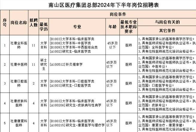 社康招 65 人!深圳市南山区医疗集团总部 2024 年公开招聘