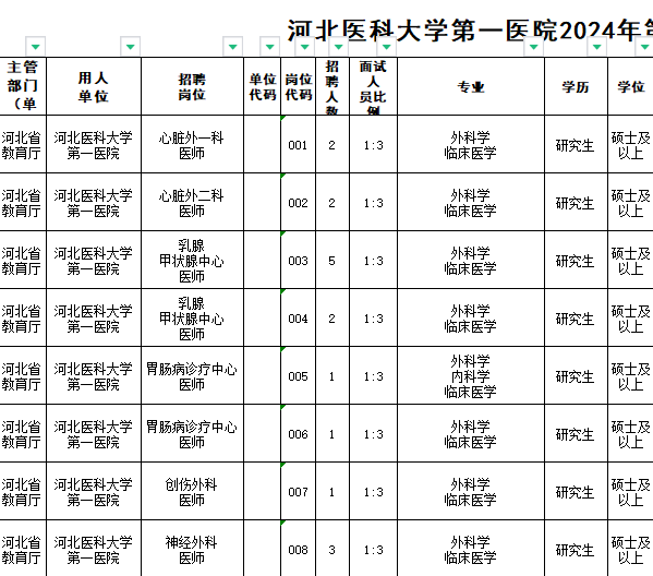 河北医科大学第一医院是一所以脑病和心血管病诊疗为主要特色,集医疗、教学、科研、急救、预防保健和健康管理为一体的三级甲等综合性医院。据《河北省事业单位公开招聘工作人员暂行办法》,经省人力资源和社会保障厅批准,河北医科大学第一医院 2024 年拟面向社会公开招聘工作人员。现将有关事项公告如下: