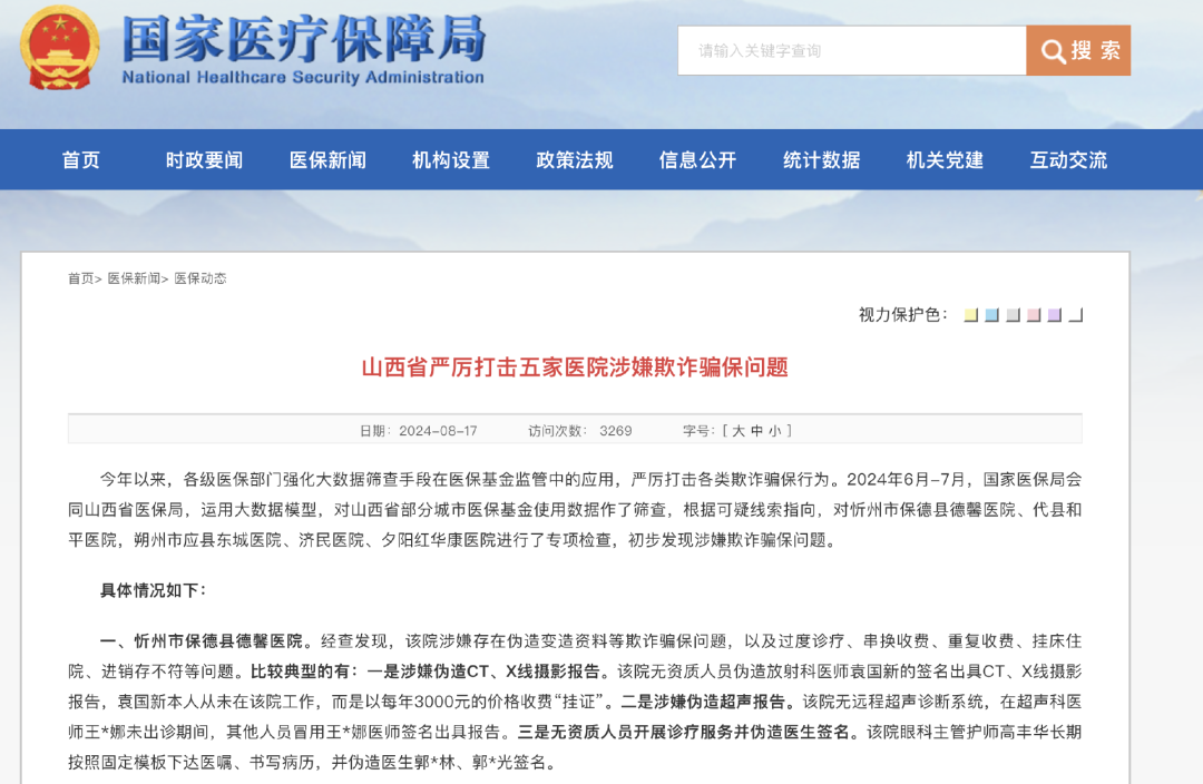 如今年 8 月 17 日刚刚公布的一起山西忻州市保德县德馨医院欺诈骗保事件,除了涉嫌伪造变造资料、过度诊疗、串换收费、重复收费、挂床住院、进销存不符等问题外,更加「专业化」的是,医院涉嫌伪造 CT、X 线、超声报告: