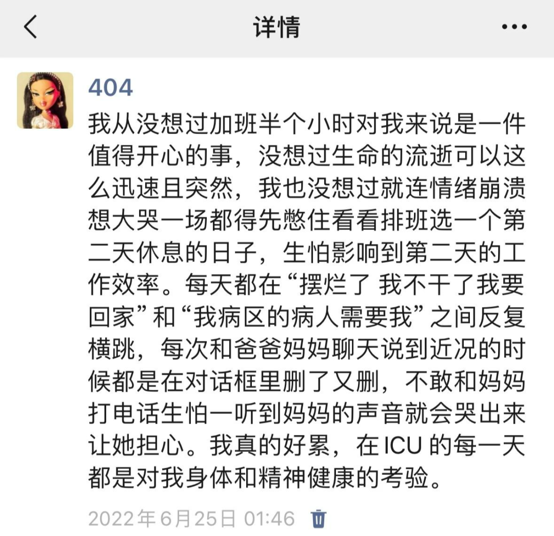 ICU 的工作繁重又紧急,因长时间站立我患上了静脉曲张,频繁的三班倒又让我患上神经衰弱。即便已过去快一年,我腿上依旧爬着深深浅浅的不规则网状印记,睡觉时依旧得保持环境无光无音。
