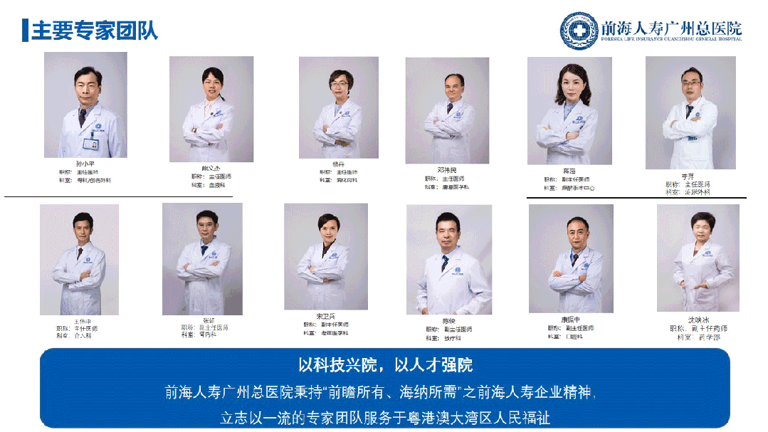 前海人寿旗下医院专家团队共拥有高级职称人员 100 余人,硕博人才 200 余人,学科带头人 100 余人。70% 人员具备三级以上医院工作经验,均来自中山大学,南方医科大学各大附属医院、南部战区总医院、广西自治区人民医院等知名综合性三甲医院,医院临床业务人员整体素质已达到市级教学医院水平,团队的专业技术能力整体达到国内领先水平。