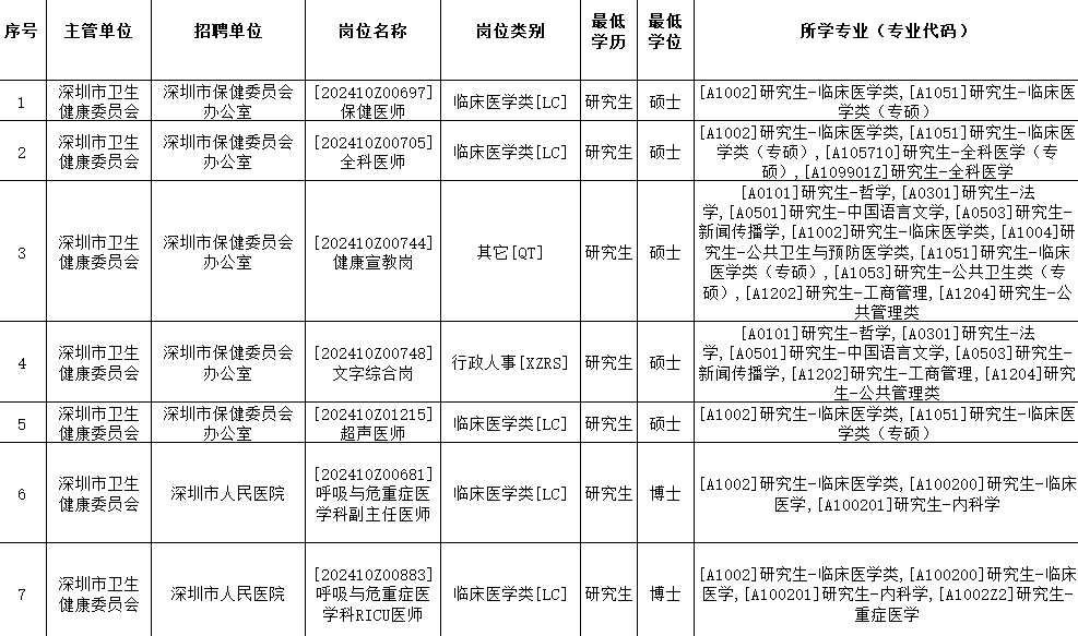 为加强我市卫生健康系统队伍建设,打造一流健康城市和国际化医疗中心城市,根据国家、省和我市关于做好高校毕业生就业工作的会议和文件精神,结合我市卫生健康行业发展和人才需求实际,深圳市卫生健康委员会决定于 2024 年 10 月—12 月期间开展 2024 年深圳市卫生健康系统人才招聘工作,现将有关事宜公告如下: 点击查看完整招聘公告