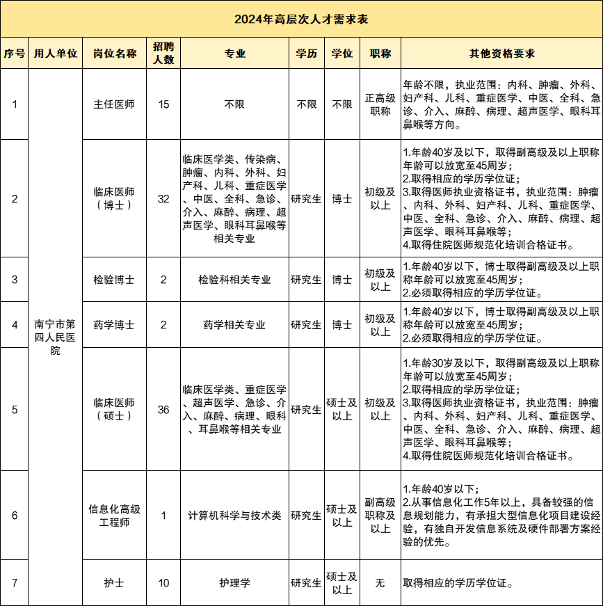 Part.03医院引进补贴引进的高层次人才,除享受引进补贴外,其安家费、科研经费补助和薪资待遇按《南宁市第四人民医院全日制博士引进办法的通知》、《南宁市第四人民引进高级职称医学类卫生专业技术人员的暂行规定》的有关规定执行。