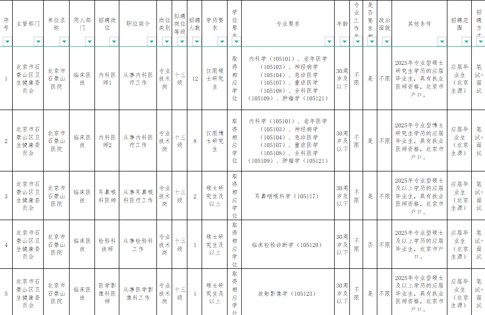 招 51 名!北京市石景山医院 2025 校园招聘