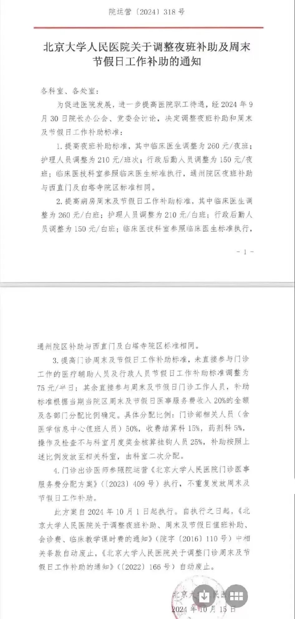2024 年 10 月 15 日,北大人民医院发文提及「提高临床医护人员及行政后勤人员夜班、周末、节假日补助」。