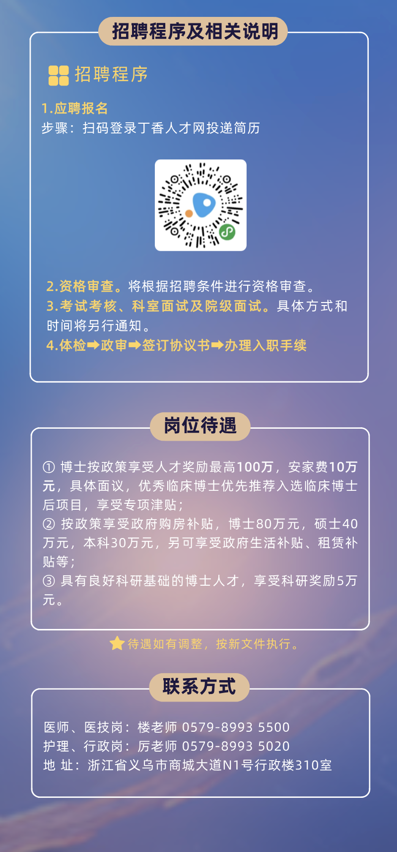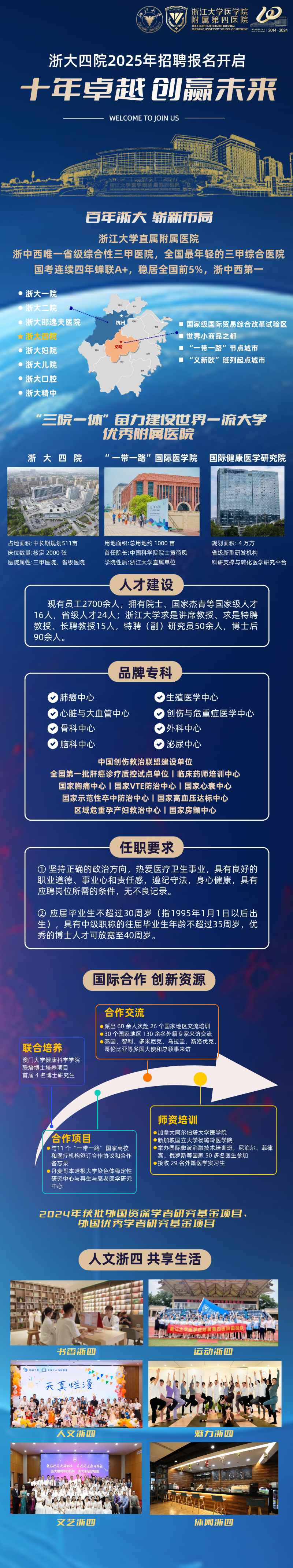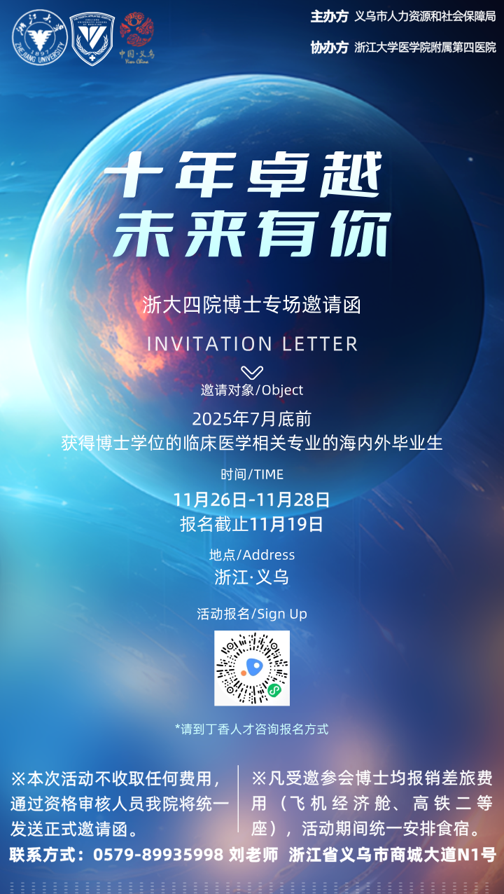 浙大四院博士专场邀请函 参与报销差旅费 还有 2025 年 251 人医技护岗位不要错过日期:2024-11-09 来源:丁香人才公众号 浙江大学医学院附属第四医院 邀您加入 应聘· 图片来源:浙江大学医学院附属第四医院 微信扫一扫分享资讯上一篇:招 143 名!丽水市人民医院 2025 年公开招聘下一篇:事业编制 | 公立三甲医院诚邀优秀人才共谋发展