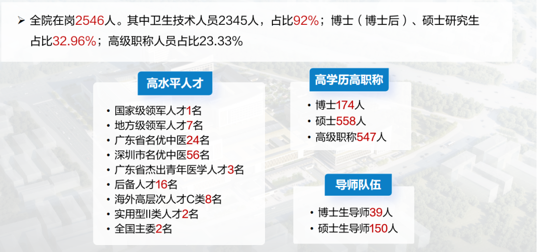 深圳市中医院始建于 1975 年,是全国 首批三级甲等中医医院。现有福田院区床位 1,200 张,光明院区拟增设 2,000 张。医院设有福田院区、光明院区、针灸推拿分院、一门诊部和科教中心 「一院五区」 。国考连续 5 年 A+ ,2021 年度国家公立医院绩效考核位列中医类医院 全国第五 ,全省第一;2022 年度 全国第八 ,全省第二。 光明院区已于今年七月 开业 ,期待您的加入。