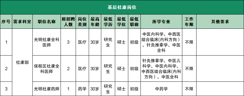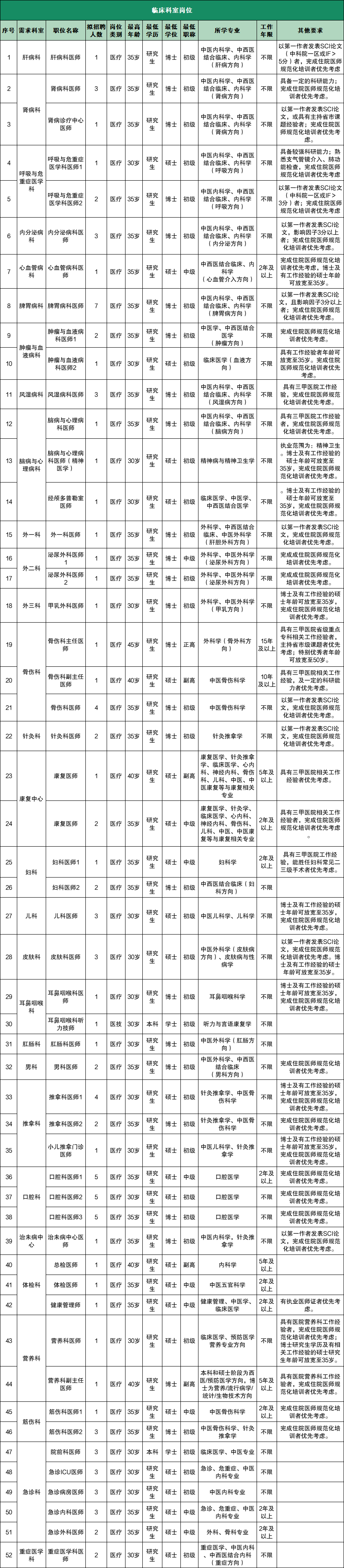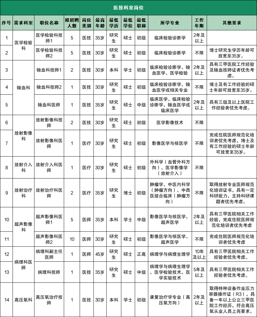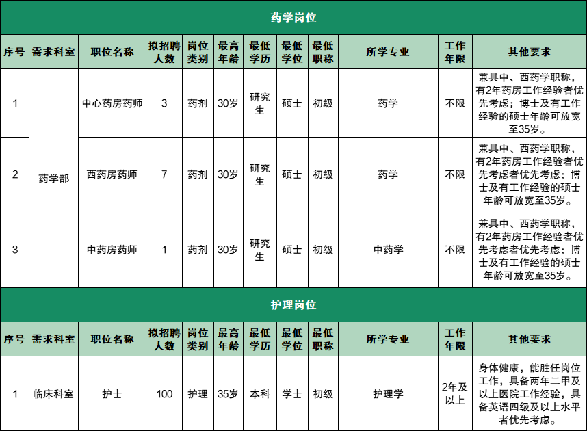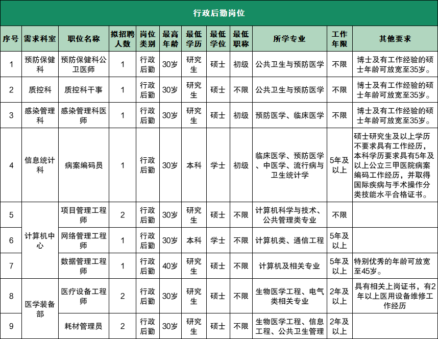 此次招聘涵盖行政后勤、临床、医技、药护等人员,具体岗位要求如下: