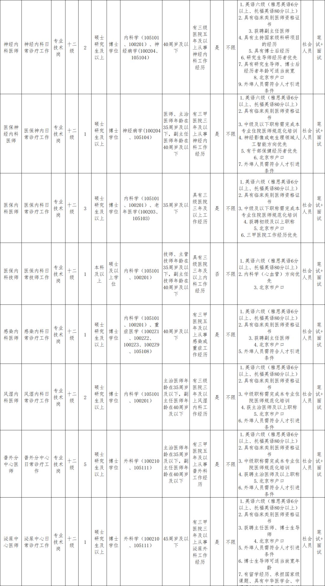 非北京户籍须符合本市人才引进审批条件;医疗岗位完成相应住院医师规范化培训;其他具体需求详见链接。