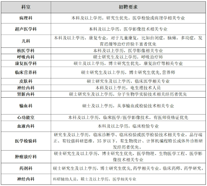 临床医师岗位: 需研究生学历、博士学位,临床医学相关专业。2010 年以后毕业的学生须完成住院医师规范化培训并取得卫生部颁发的《住院医师规范化培训合格证书》并取得医师资格证书。