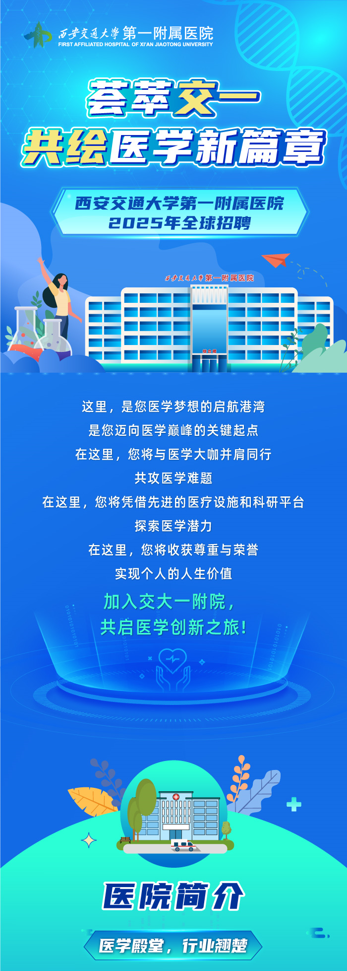 报名截止 1 月 20 日 本硕博均有岗 | 西安交通大学第一附属医院 2025 年招聘开启日期:2025-01-10 来源:丁香人才公众号· 图片来源: 西安交通大学第一附属医院微信扫一扫分享资讯上一篇:高薪纳贤|汕头大学医学院诚聘博士后下一篇:招医药护技 91 人!三亚市第二人民医院 2025 年工作人员招聘