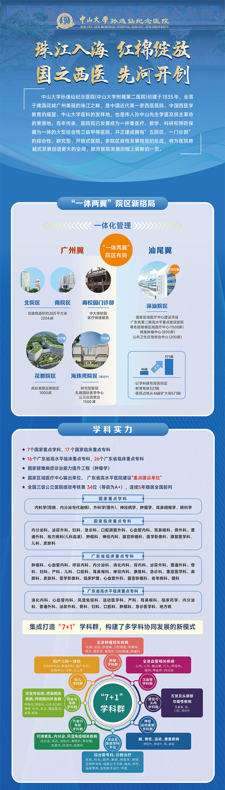 中山大学孙逸仙纪念医院始建于 1835 年,坐落于花城广州,是中国近代第一家西医医院,中国西医学教育的摇篮,中山大学医科的发祥地,也是伟人孙中山先生学医及民主革命的策源地。百年传承,医院现已发展为一所集医疗、教学、科研和预防保健为一体的大型综合性三甲医院,并朝着中国特色、世界一流的研究型医院建设目标快步前进!