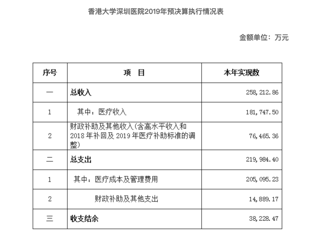 有数据显示,截至 2018 年底,深圳市政府共向香港大学深圳医院拨付财政补助资金 15.8 亿元。据 2019 年决算数据显示,该医院总收入 25.8 亿,其中财政补助 7.6 亿。其兄弟院校深圳大学附属第一医院的决算数据中财政补助(含其他收入)约 4.3 亿。