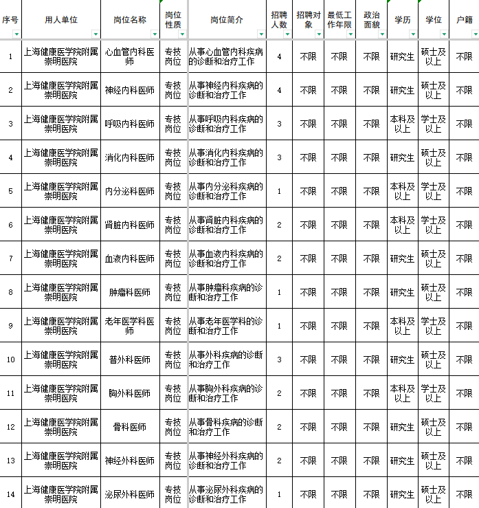 2. 具备招聘岗位规定要求的资格条件、工作能力和身体素质, 详见下方链接。 点击查看完整招聘条件信息来源:上海市崇明区卫生健康委员会