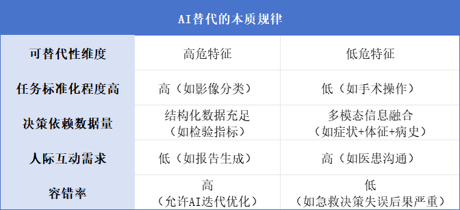 慢病管理:高血压/糖尿病患者的用药提醒、数据监测。 不可替代部分:查体触诊、症状鉴别诊断(如胸痛的心源性 vs 非心源性判断)、复杂医患沟通。