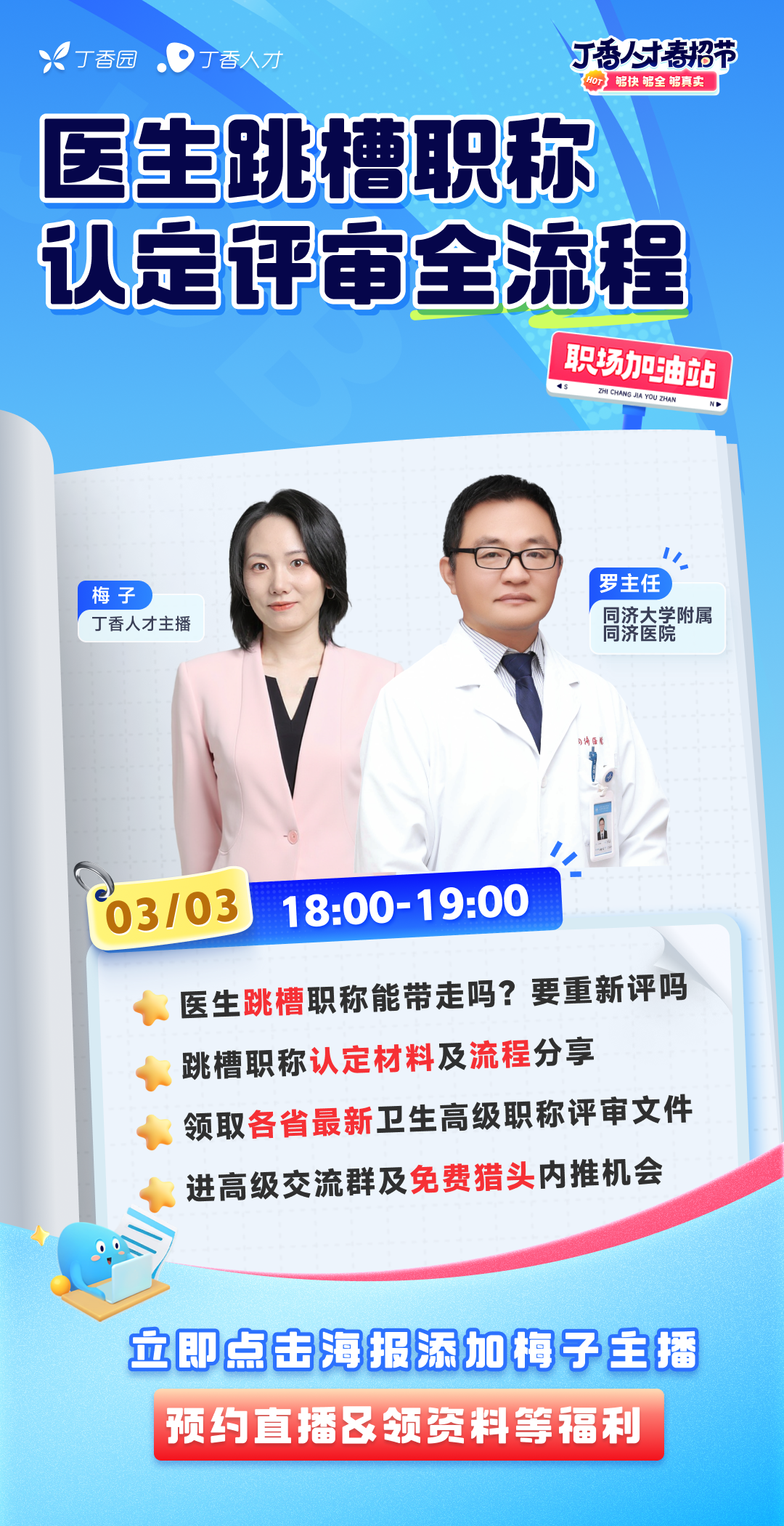 ....为了给大家答疑解惑, 下周一晚上 18:00 丁香人才梅子主播邀请了「同济大学附属同济医院」的 罗居东主任,在丁香人才视频号进行 「医生跳槽职称认定评审全流程」 直播,干货满满!