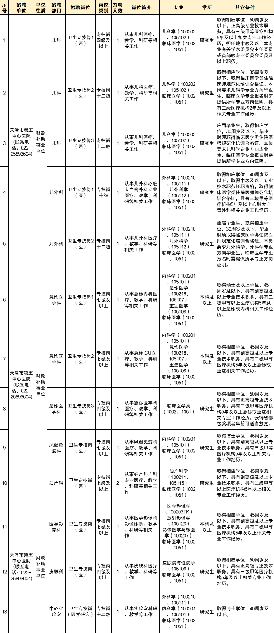 根据《天津市事业单位公开招聘人员实施办法(试行)》(津人社局发〔2011〕10 号)、《市委组织部市人力社保局关于进一步完善事业单位公开招聘工作的通知》(津人社局发〔2017〕37 号)等有关文件要求,为满足用人单位人才队伍建设需求,天津市第五中心医院拟面向社会公开招聘高层次和紧缺人才,现将有关事项公告如下: