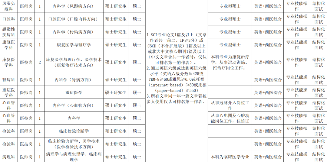 3. 医师岗的本科专业应为临床医学类、口腔医学类、中医学类、中西医结合类专业。硕士医技岗的本科专业应为相近专业。硕士护理岗的本科专业应为护理学类专业。