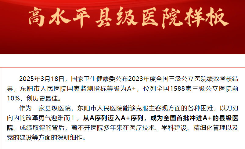 据医院官方公众号发布:作为一家县级医院, 东阳市人民医院在 2023 年度全国三级公立医院绩效考核中,国家监测指标等级为 A+!位列全国 1588 家三级公立医院前 10%,创历史最佳!