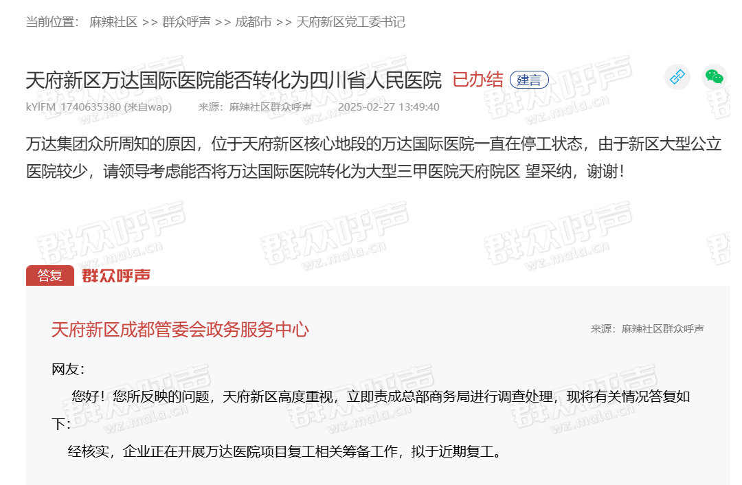图源: 四川省网上群众工作平台在四川人专属的 「麻辣社区」 (四川省网上群众工作平台) 有一条留言,大意是:因万达集团前些年战略调整和行业环境的变化,这家原本预计 2022 年竣工, 2023 年开业的万达国际医院项目停滞。 从人民群众日常医疗需求的角度看来,那让咱们自己省的大三甲分院「接盘」也是双赢的事,成不成? 点击查看公立医院招聘信息