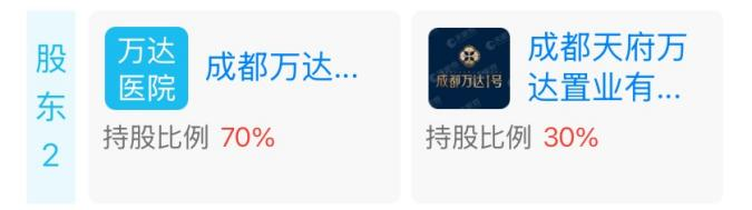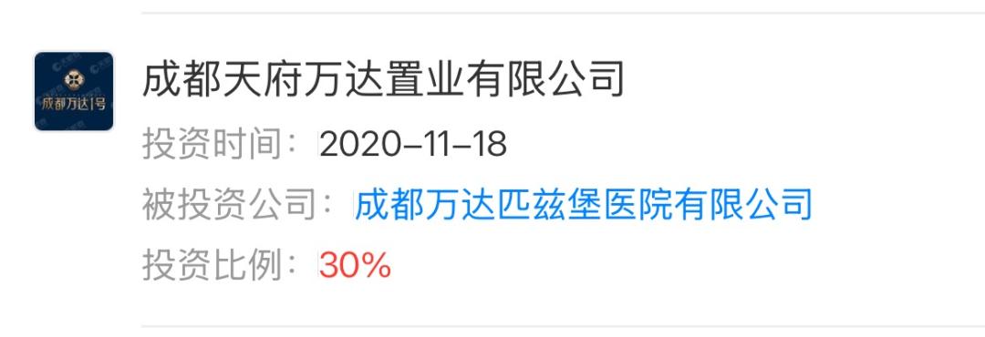 点击查看民营医院招聘信息 根据天眼查企业工商查询信息显示:成都天府万达置业有限公司于 2020 年 11 月投资了成都万达匹兹堡医院有限公司。万达投资比例公开显示 30%,成都万达医院管理公司 (港澳台法人独资) 持股剩余 70%。