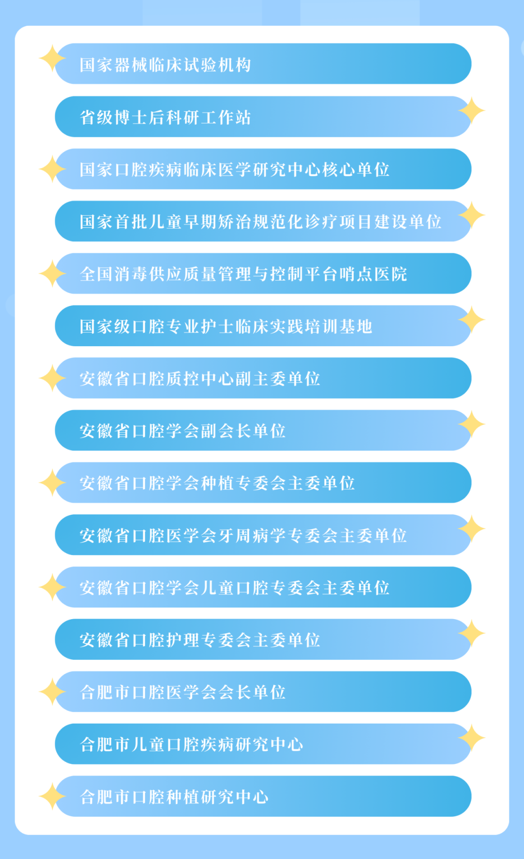 近年来,医院大力实施「科教兴院」战略。共获得省、市科技进步奖 21 项,其中省级及以上科技奖 6 项,市级科技奖 15 项;获批省市级及以上科研项目 105 项;获批国家发明专利 4 项、实用新型专利 133 项;举办国家级、省市级继教学习班 128 期,累计培训学员万余人。医院作为安徽医科大学合肥口腔临床学院、皖南医学院和蚌埠医科大学硕士生培养点,目前拥有口腔医学专业硕士生导师 22 名,兼职教授、副教授 11 名。