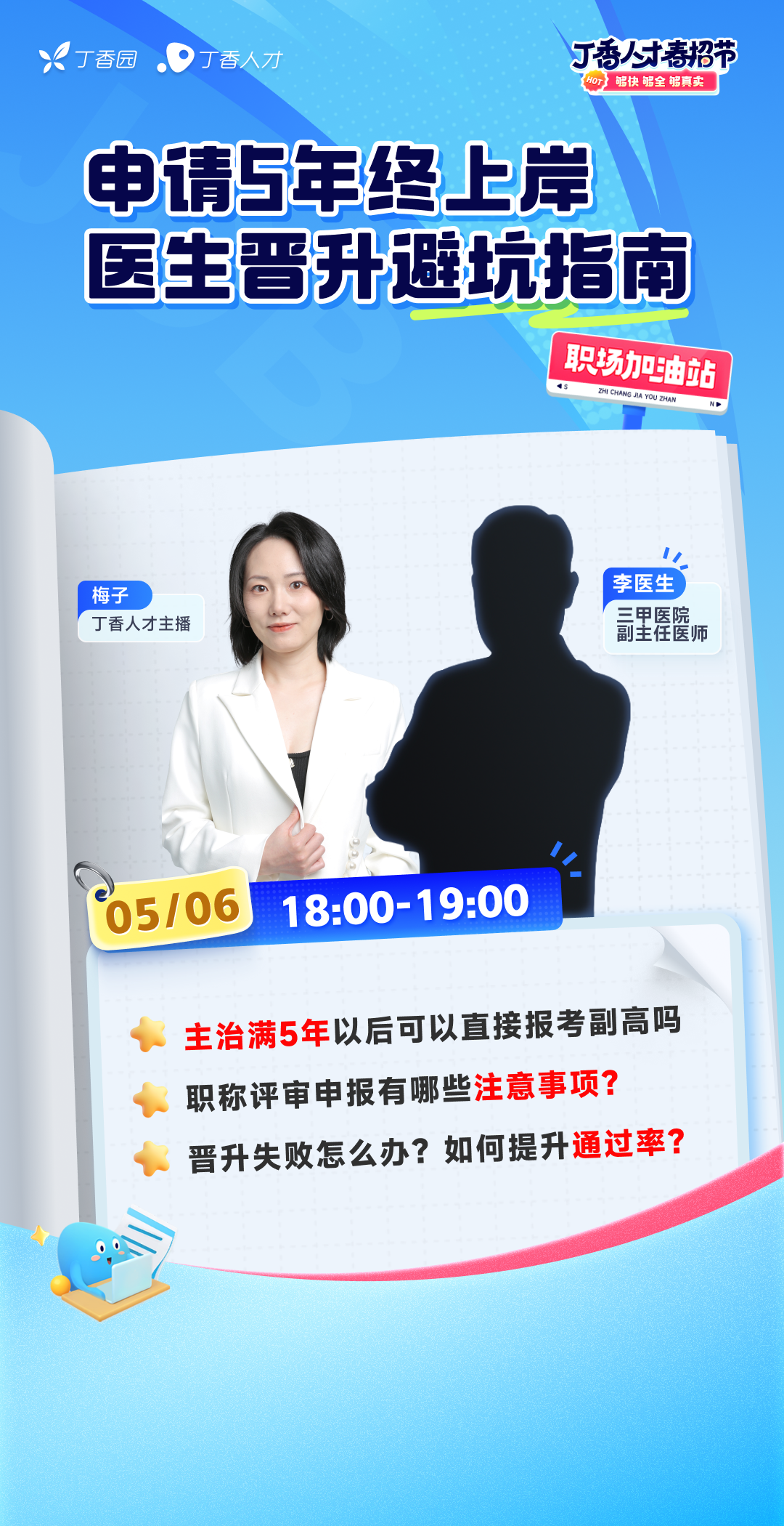 为了给大家尽可能详细地进行答疑解惑, 5 月 6 日周二晚上 18:00  丁香人才梅子主播邀请了李医生 ,在丁香人才视频号进行 「医生晋升避坑指南」 直播,还没有过晋升经历的老师一定要来听!