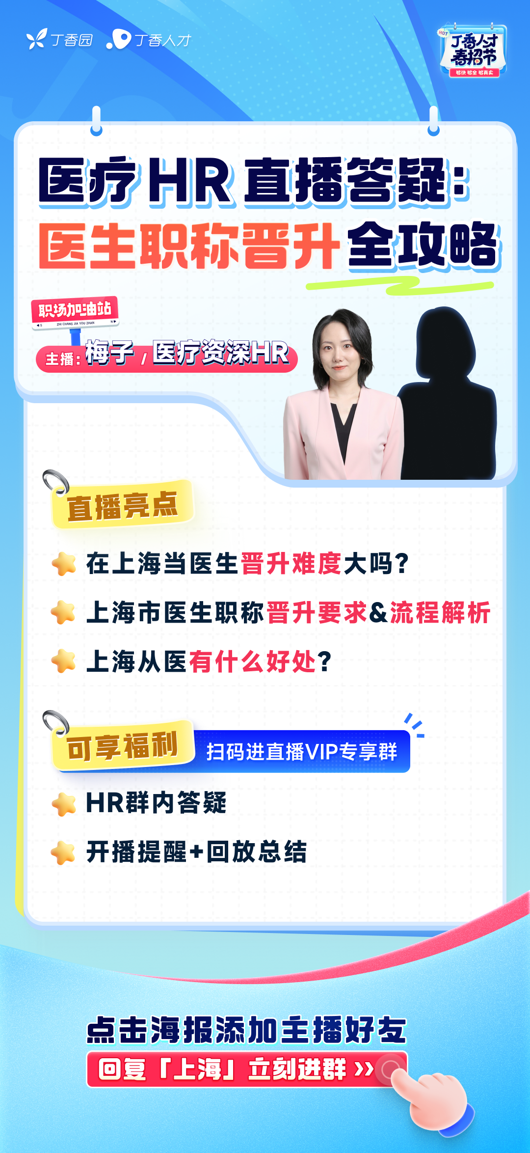 「如果跳槽到上海医院,职称需要重新认定吗」 ...... 为了给大家尽可能详细地进行答疑解惑, 5 月 13 日周二晚上 18:00 丁香人才梅子主播邀请了上海市资深医疗 HR 老师 ,在丁香人才视频号进行 「医生职称晋升全攻略」 直播,为了保证每位老师的问题都有机会被解答到,直播结束后 HR 老师将会入群进行答疑,机会难得!