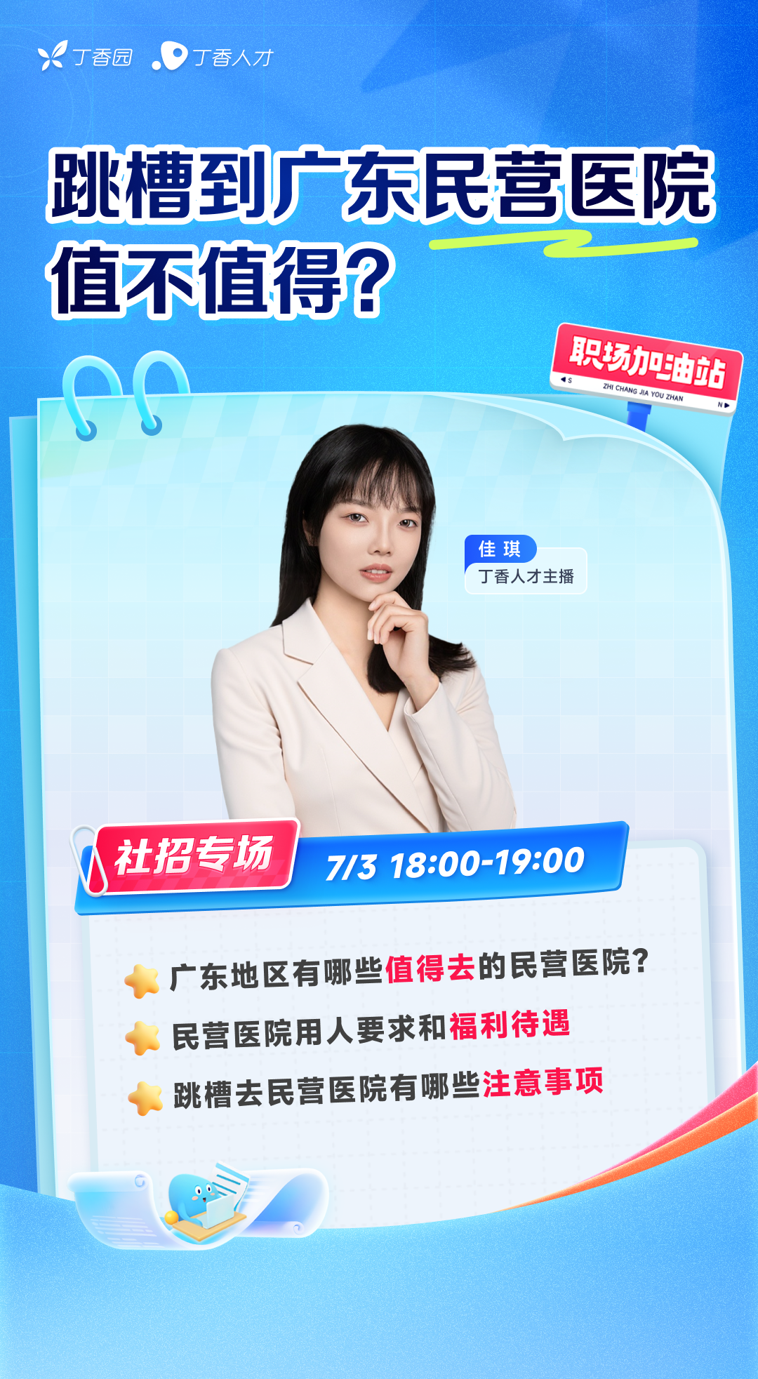 那这些民营医院到底值不值得去?有什么要求?福利待遇实际怎么样?丁香人才主播佳琪在 7 月 3 日周四 18:00-19:00 直播带你盘点广东优质民营医院有哪些? 一定要来听哦