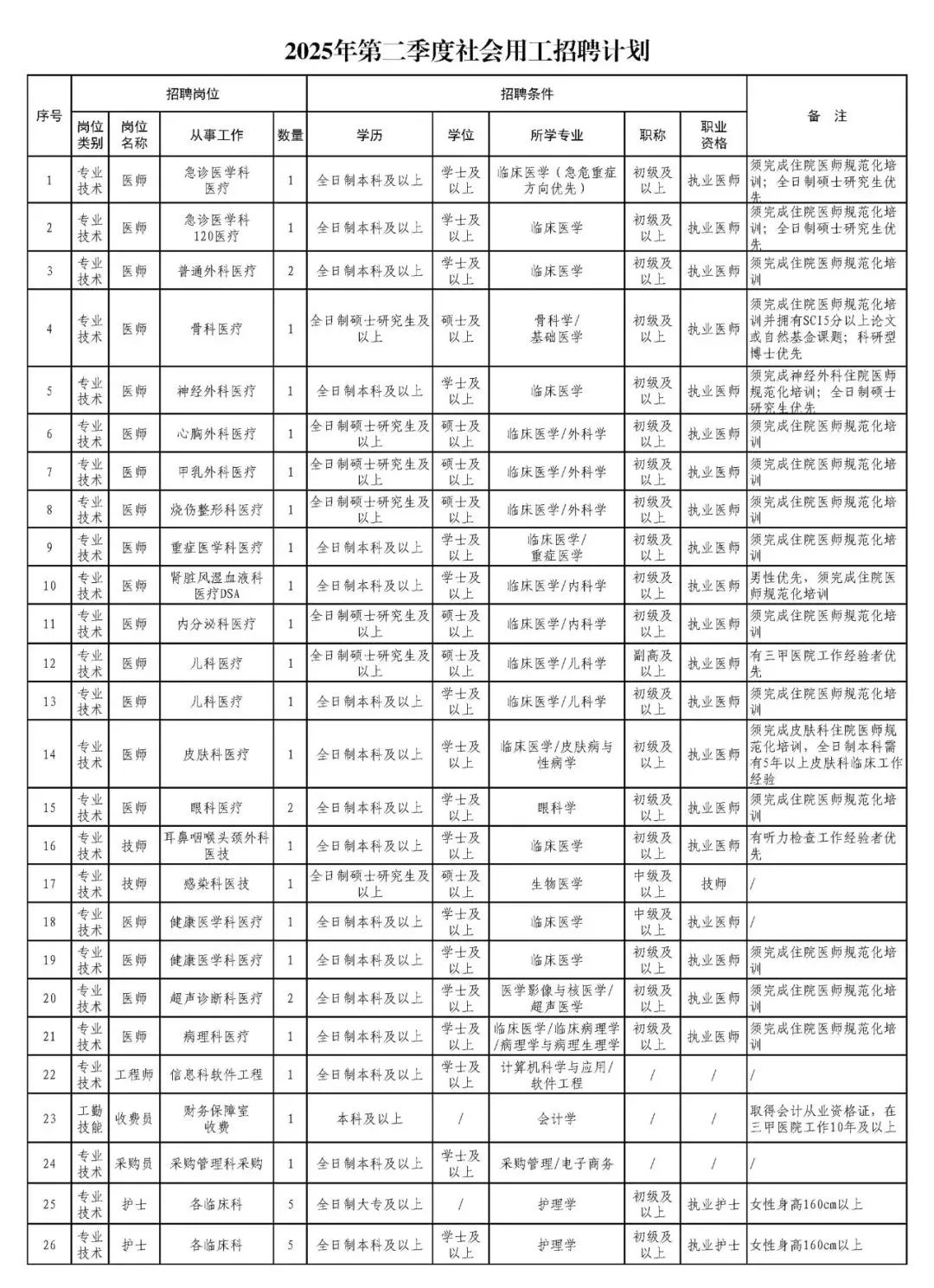 医院二季度拟招聘医疗、医技、护理等 26 个岗位,各岗位详细信息如下: