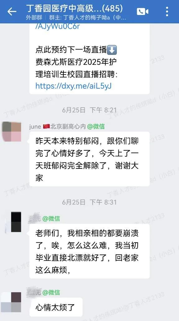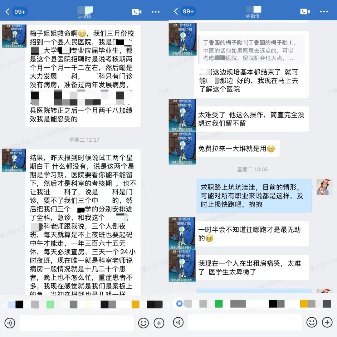 至于这位同学所学专业科室,直接就去不了了!医院单方面把她安排进了急诊,三个人倒夜班,3 天一个 24 小时夜班? 一年 365 天无休 ?此时,其他医院招聘已经结束,同学想跑路都晚了, 只能坐在离家很远的出租屋里大哭一场。 如果,这位同学当时能有一两个同行交流群 点此加入丁香人才求职交流群, 问一问群里全国各地医疗专业的同辈、前辈们……不管是应届生入职避雷求经验,还是将来萌生跳槽意向,都能在群里问上两句,互不相识的网友就是最能爆料的 (这是真的) 。