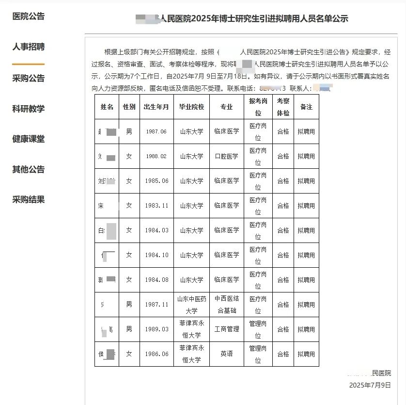 近日,丁香园论坛心情驿站版主 @杀手洞 发帖称:山东某公立医院在 2025 年 7 月 4 日公布了拟聘用的 10 名博士名单。其中 8 个是山东大学出来的,剩下的 2 个毕业院校是 菲律宾永恒大学。