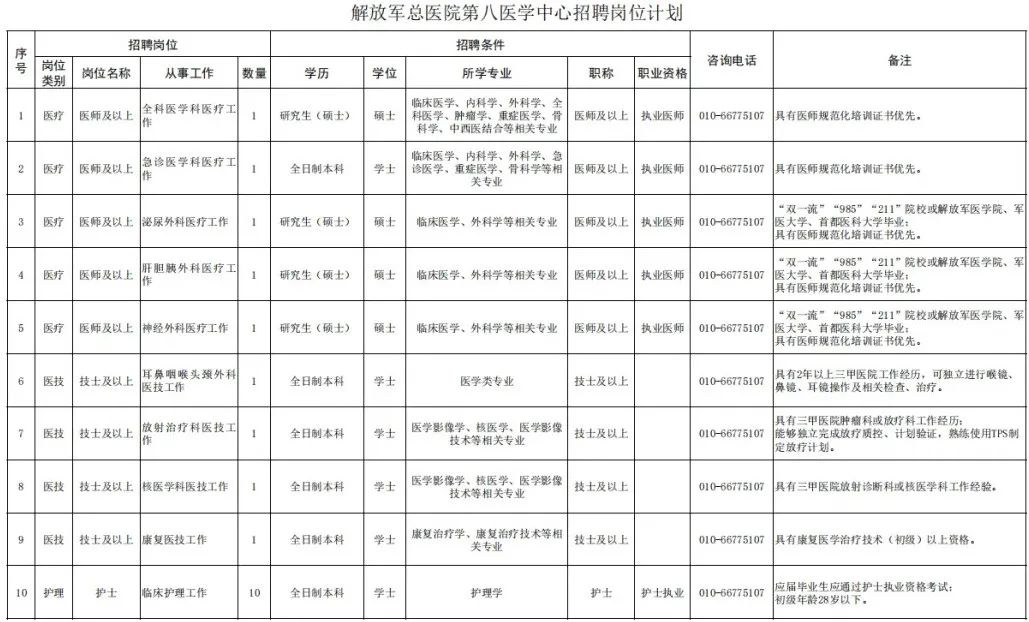 本次招聘计划 10 个岗位、19 人。涵盖医疗、医技、护理等类别,详见解放军总医院第八医学中心招聘岗位计划。