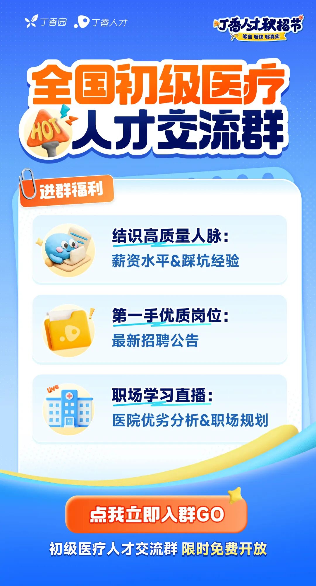 在职业发展的关键节点,获取准确信息才能做出最优决策,在医疗行业,这一点尤其重要! 为此,丁香人才组建了 全国初级医疗人才交流群 ,专门 为初级医师们提供信息与支持! 点此入群